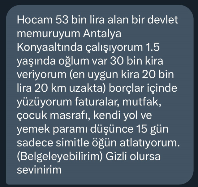 Memur, mesajının gizli kalmasını isterken, ekonomik zorluklarını belgeleyebileceğini de ekledi. Bu paylaşım, büyükşehirlerde yaşayan sabit gelirli vatandaşların durumunu bir kez daha gözler önüne serdi.