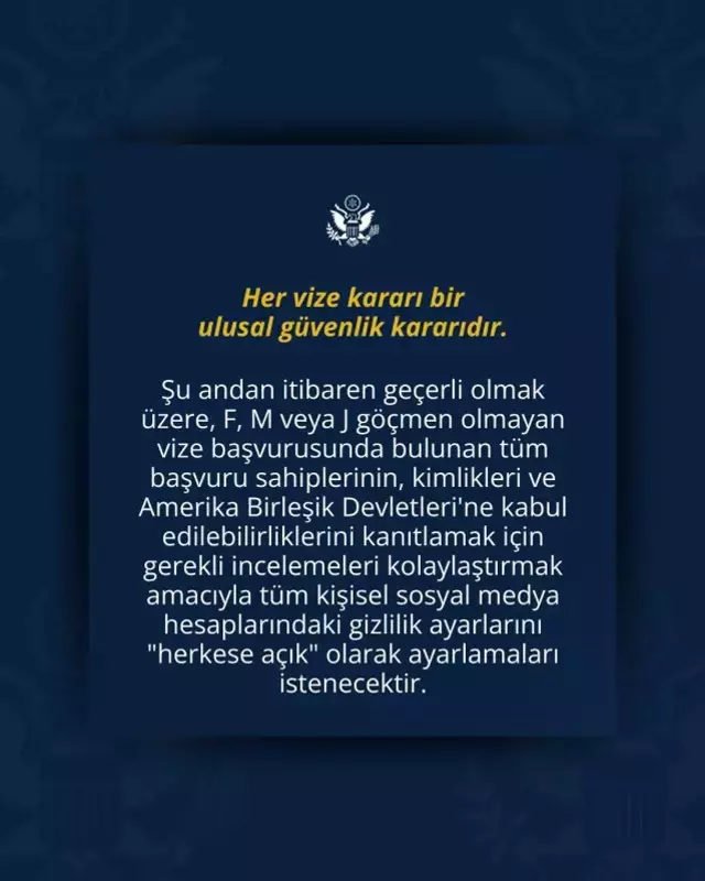 ABD Ankara Büyükelçiliği’nin sosyal medya hesabından, “Her vize kararı bir ulusal güvenlik kararıdır” notuyla paylaşılan duyuruda, vize başvurularında kişilerin sosyal medya hesaplarının “herkese açık” olması zorunluluğunun geldiği bildirildi.