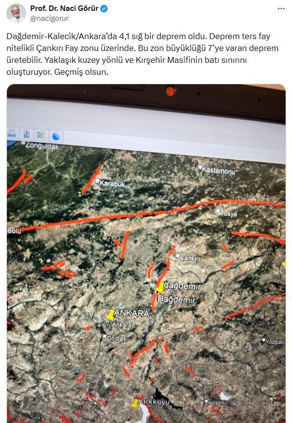 “Dağdemir-Kalecik/Ankara’da 4.1 büyüklüğünde sığ bir deprem oldu. Deprem ters fay nitelikli olup, fay hattı yaklaşık kuzey yönlü ilerliyor ve Kırşehir Masifi’nin batı sınırını oluşturuyor. Geçmiş olsun.”