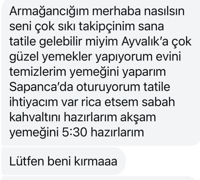 Mesajı gönderen kadın takipçi, Armağan Çağlayan’a tatil için birlikte vakit geçirme teklifinde bulundu. Ancak mesajın tonu ve ısrarcı tavrı, Çağlayan’ı hem şaşırttı hem de güldürdü. Bu sıra dışı talebi sosyal medya üzerinden paylaşan deneyimli yapımcı, takipçilerinden yoğun ilgi gördü.