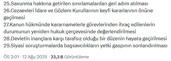 CHP’nin önerdiği 29 maddelik demokratikleşme paketinin öne çıkan başlıkları arasında anayasanın askıya alınamayacağı, Gezi tutuklularının serbest bırakılması, ifade özgürlüğünün güvence altına alınması ve kayyum uygulamasına son verilmesi yer alıyor. Ayrıca, görevlerini kötüye kullanan hakim ve savcıların cezalandırılması, terör ve örgüt üyeliği tanımlarının netleştirilmesi gibi önemli maddeler bulunuyor.
