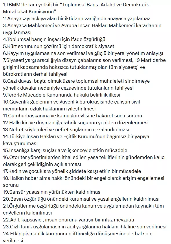 - TBMM’de tam yetkili bir “Toplumsal Barış, Adalet ve Demokratik Mutabakat Komisyonu”