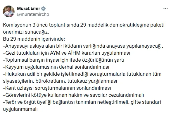 CHP Grup Başkanvekili Murat Emir, Milli Dayanışma, Kardeşlik ve Demokrasi Komisyonu’nun 3. toplantısında partisinin hazırladığı 29 maddelik demokratikleşme paketi önerisini sundu. Pakette, “19 Mart darbe girişimi kapsamında haksızca tutuklanmış olan tüm siyasetçi ve bürokratların derhal tahliyesi” talebi de bulunuyor.