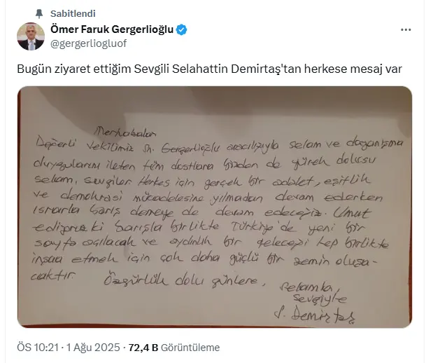 Demirtaş’ın cezaevinden gönderdiği bu mesaj, son dönemde yeniden gündeme gelen çözüm ve normalleşme arayışlarına dair dikkat çeken bir çıkış olarak yorumlandı.