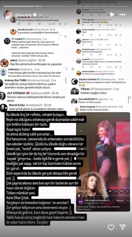 Çıtak ayrıca, hem videoyu yayanlar hem de hakaret içerikli yorumlar yapanlara karşı hukuki süreç başlatıldığını açıkladı. Olayla ilgili gerçeklerin ortaya çıkacağına dair mesajını da “Sevgiler” notuyla sonlandırdı.