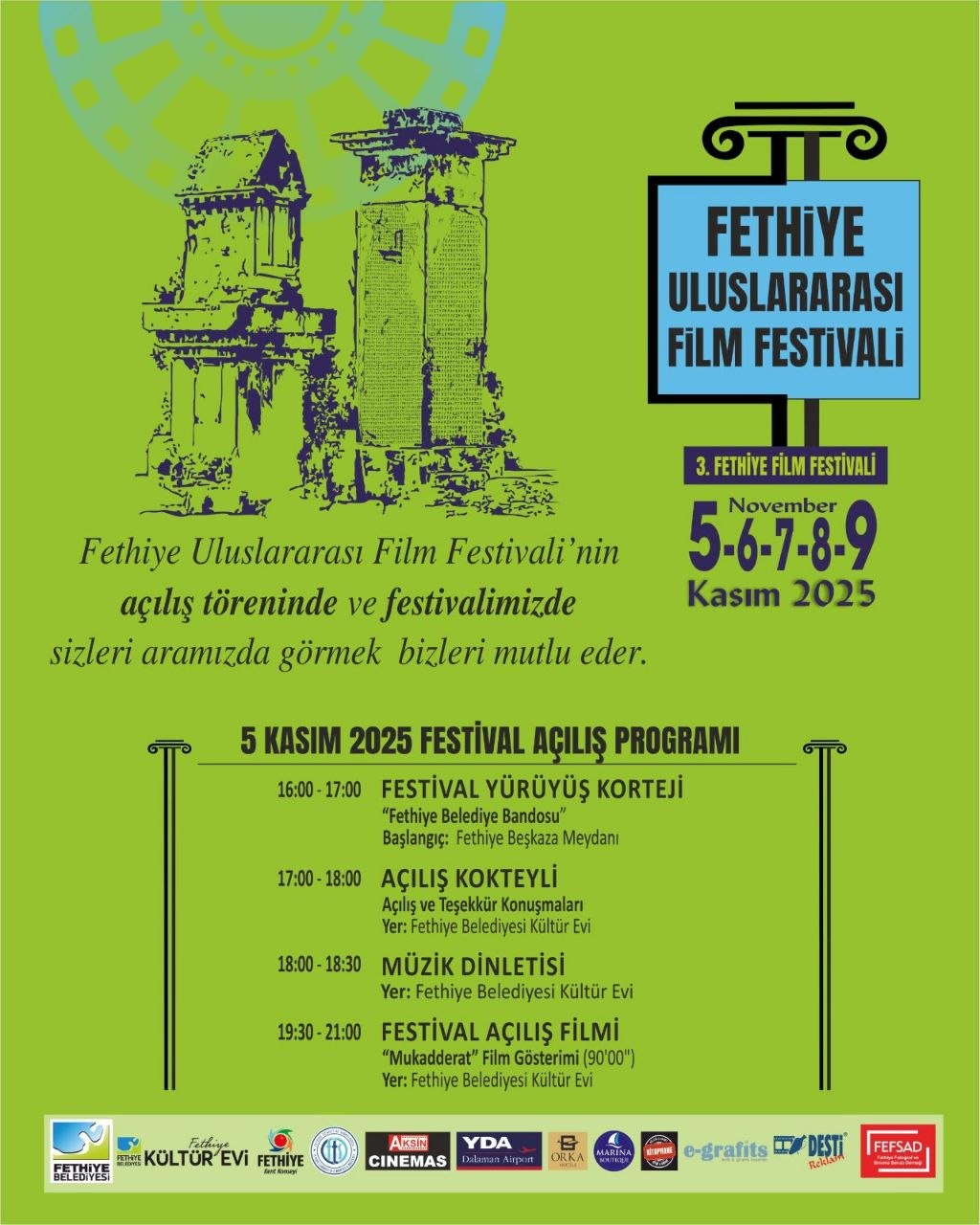 3.Fethiye Uluslararası Film Festivali Fethiye Belediyesi Bandosunun öncülük edeceği saat 16:00’da Beş kaza Meydanı’ndan başlayacak kortej ile başlayacak ve Fethiye Kültür Evi’nde saat 17:00’deki Muğla Valisi İdris Akbıyık, Fethiye Kaymakamı Fatih Akkaya, Fethiye Belediye Başkan Yardımcısı Oğuz Bolelli, Fethiye Belediyesi Kültür İşleri Müdürümüz Halime Ok katılımı ve açılış konuşmalarıyla ve kokteyl ile devam ederek yerini Film Müzikleri orkestrasının konserine bırakacak.