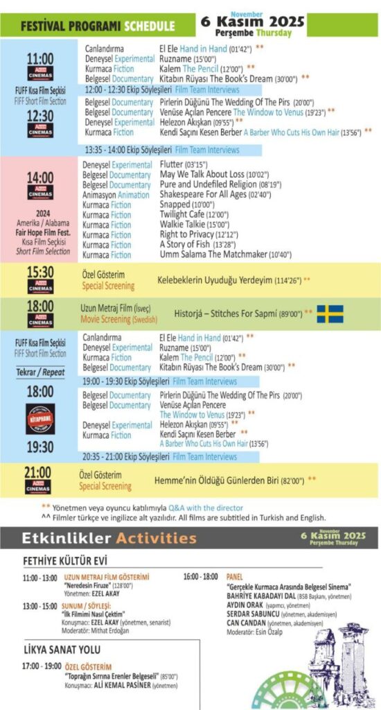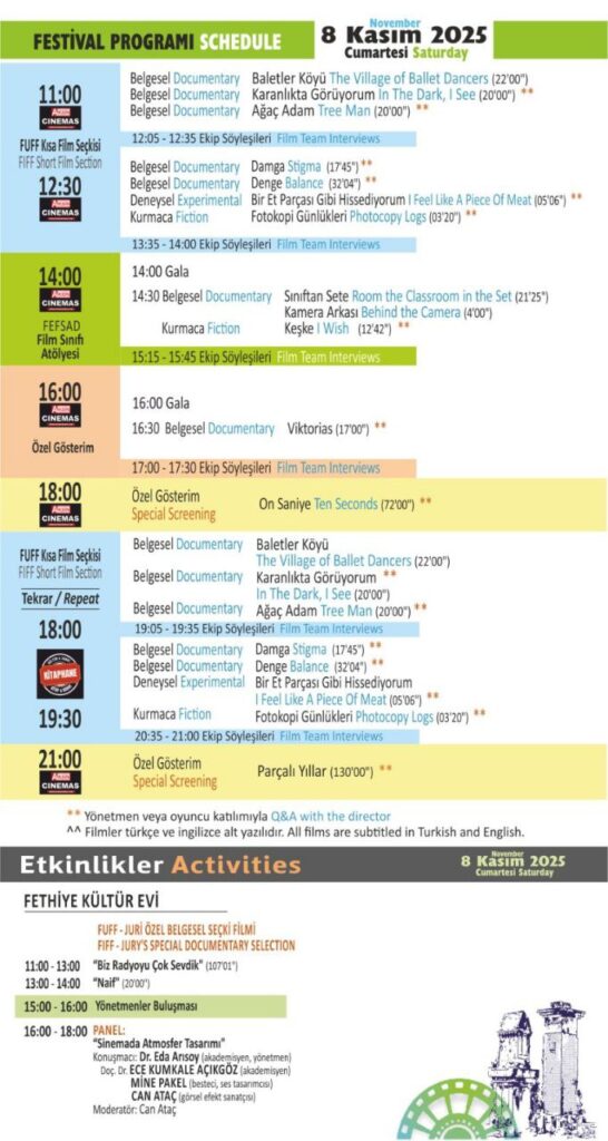 Festival, 5-6-7-8-9 Kasım 2025 tarihlerinde halka açık ve ücretsiz olarak yerli ve yabancı film gösterimleri, yönetmen buluşmaları, atölyeler ve paneller ile gerçekleşecek.
