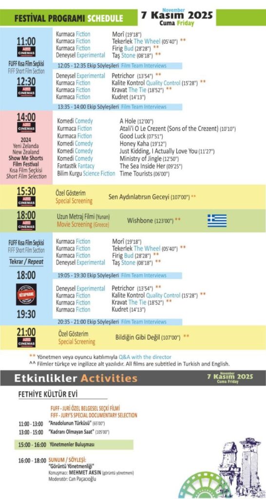 FUFF 2025 gösterim ve etkinlik mekanları ERASTA AVM Aksin Sineması, Fethiye Belediyesi Kültür Evi, Kitap hane ve Likya Sanat Yolu olarak belirlendi.