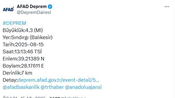 Balıkesir’in Sındırgı ilçesinde, geçtiğimiz günlerde yaşanan 6,1 büyüklüğündeki depremin ardından süren sismik hareketlilik devam ediyor. AFAD verilerine göre bugün saat 13.13’te 4,3 büyüklüğünde bir sarsıntı daha kaydedildi. Depremin derinliği yaklaşık 7 kilometre olarak ölçülürken, sarsıntı çevre illerde de hissedildi.