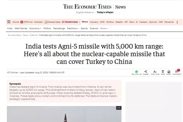 Hindistan medyası, son aylarda art arda yaptığı füze testleriyle gündeme gelirken, Türkiye’ye yönelik provokatif ifadelerini de sıklaştırdı. Mayıs ayında India.com sitesinde yayımlanan bir haberde, Agni-5 için “Türkiye’yi 6 dakikada yok edebilir” sözleri manşete taşınmıştı.