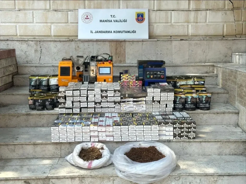 Manisa’nın Alaşehir ilçesinde jandarmanın düzenlediği operasyonda on binlerce sarılmış sigara, makaron ve 25 kilo kıyılmış tütün ele geçirildi.