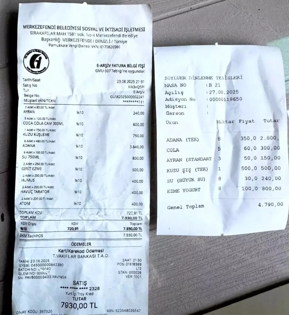 Sosyal tesislerde daha uygun fiyat beklerken yüksek ücretle karşılaşan C.C., “Yemek adeta mideme oturdu” sözleriyle yaşadığı hayal kırıklığını dile getirdi. Birkaç gün sonra tatil programı kapsamında Muğla’ya giden vatandaş, bu kez aynı siparişi Denizli-Muğla karayolu üzerindeki turistik bir dinlenme tesisinde verdi. Sonuç ise şaşırtıcıydı: Aynı yemek için yalnızca 4 bin 790 lira ödedi.