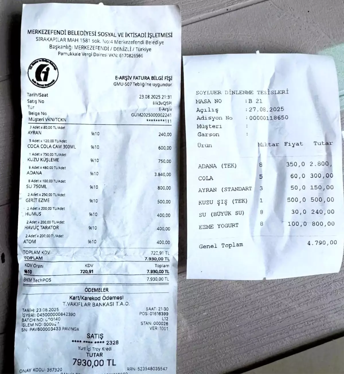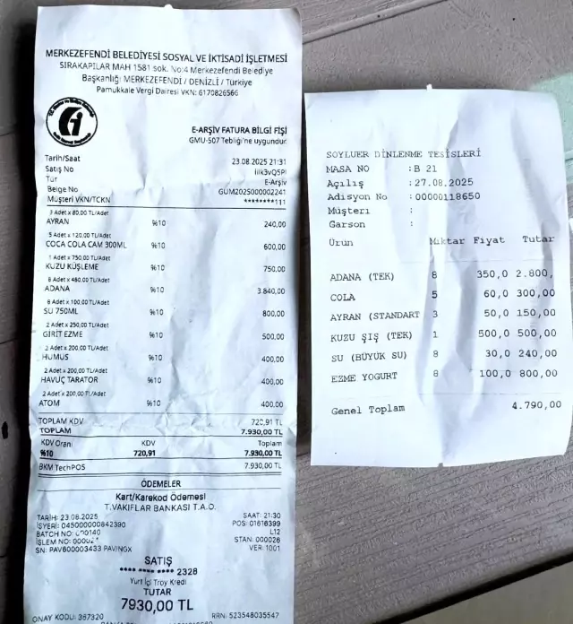 Denizli’de bir vatandaş, Merkezefendi Belediyesi’ne ait sosyal tesiste ödediği hesapla büyük bir şaşkınlık yaşadı. İstanbul’dan akraba ziyareti için kente gelen C.C., misafiri olduğu aileyle birlikte Ornaz Vadisi Sosyal Tesislerinde yemek yedi. Ancak 8 kişilik yemek için kendisine yaklaşık 7 bin 930 lira fatura çıkarıldı.