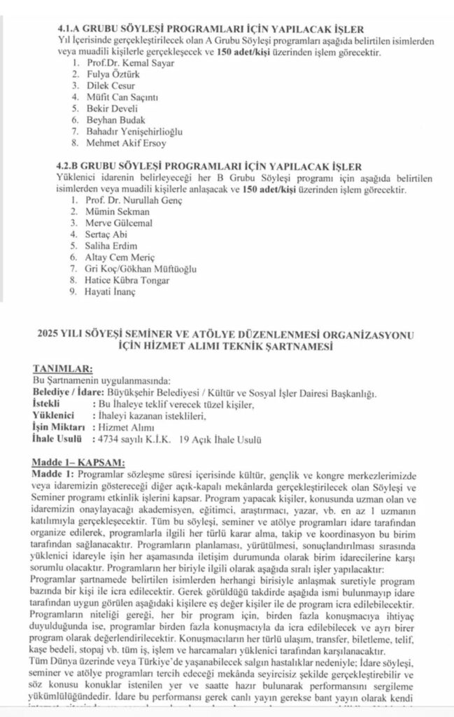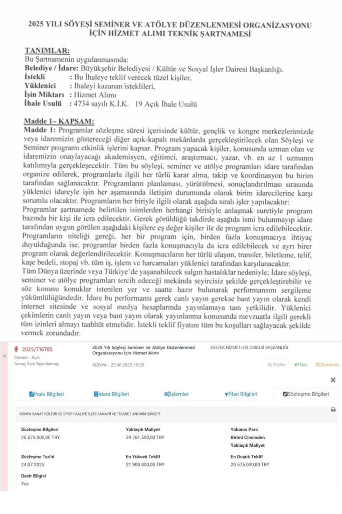 Sözcü Gazetesi, Saçıntı’nın açıklamasından kısa süre sonra ikinci bir haber yayınladı. “Yalanlamaya çalıştılar ama işte belgesi” başlıklı haberde, Konya Büyükşehir Belediyesi’ne ait “2025 yılı söyleşi, seminer ve atölye organizasyonu hizmet alımı teknik şartnamesi” yayınlandı ve belgede tüm isimlerin yer aldığı ileri sürüldü. Ancak Saçıntı, bu belgeye de sert bir şekilde karşı çıktı. X hesabı üzerinden yayınladığı ikinci videoda bu sözde belgenin herhangi bir bağlayıcılığı olmadığını belirtti: