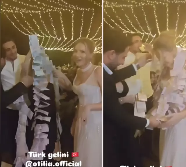 Geceye damga vuran ayrıntı ise damadın yaptığı sürpriz oldu. Karakaş, eşi Otilia’nın boynuna tomar tomar banknotlardan oluşan para kolyesi taktı. Şarkıcının üzerinde sallanan paralar davetliler arasında heyecan yaratırken, bu renkli anlar kameralara da yansıdı.