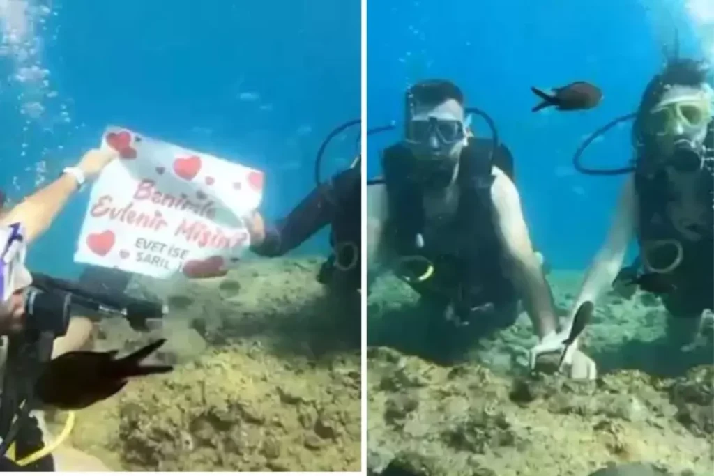 Antalya’nın Alanya ilçesinde restoran müdürü olarak çalışan 28 yaşındaki Muhammet Akbıyık, uzun süredir birlikte olduğu sevgilisi Ezgi Uysal’a unutulmaz bir evlilik teklifi hazırladı. Günün sürprizi: Tüplü dalış eşliğinde denizin altına gerçekleştirilmek üzere planlandı. Çift, Okurcalar Mahallesi’ndeki bir dalış okulunun eğitmenleri ile birlikte denize dalıyor. Akbıyık, hazırda getirdiği “Benimle evlenir misin?” yazılı pankartı çıkarıp sevgilisine soruyu yöneltiyor. Teklifin ardından yüzük takma seremonisi de denizin içinde gerçekleşiyor. Bu anlar su altı kamerasıyla kaydediliyor ve sosyal medya ile yerel medyada geniş yer buluyor.