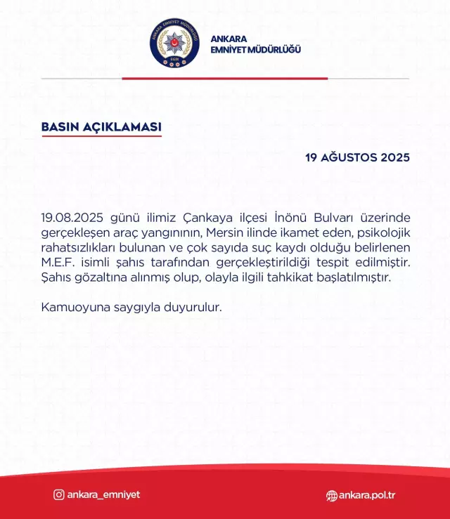 Ankara Emniyet Müdürlüğü konuyla ilgili yaptığı yazılı açıklamada, “19.08.2025 günü ilimiz Çankaya ilçesi İnönü Bulvarı üzerinde gerçekleşen araç yangınının, Mersin’de ikamet eden M.E.F. isimli şahıs tarafından gerçekleştirildiği anlaşılmıştır. Söz konusu şahsın psikolojik rahatsızlıkları olduğu ve çok sayıda suç kaydı bulunduğu belirlenmiştir. Olayla ilgili tahkikat başlatılmıştır” ifadelerine yer verdi.