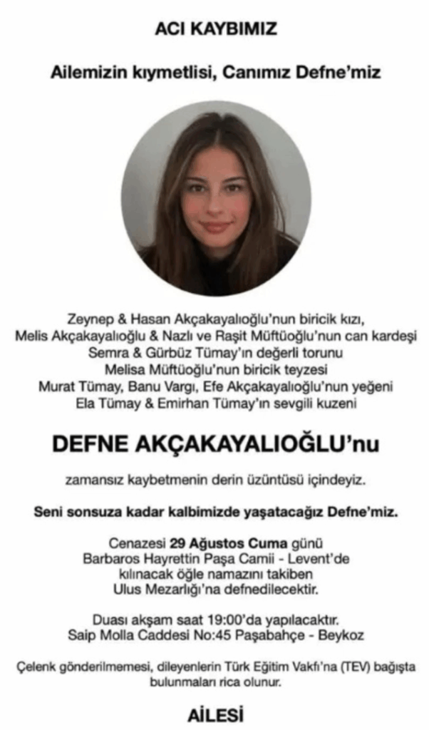 Defne Akçakayalıoğlu’nun cenazesi 29 Ağustos Cuma günü Levent Barbaros Hayrettin Paşa Camii’nde öğle namazını takiben kılınacak cenaze namazının ardından Ulus Mezarlığı’na defnedilecek. Aynı gün saat 19.00’da Beykoz Paşabahçe’deki aile evinde dua merasimi düzenlenecek.